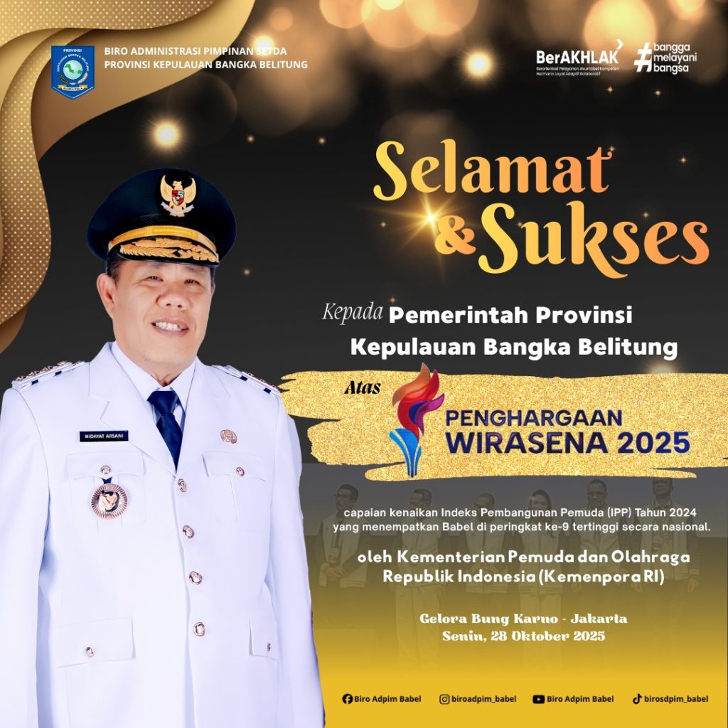 JAKARTA — Provinsi Kepulauan Bangka Belitung (Babel) kembali menorehkan prestasi di tingkat nasional. Pada peringatan Hari Sumpah Pemuda (HSP) ke-97 Tahun 2025, Kementerian Pemuda dan Olahraga Republik Indonesia (Kemenpora RI) menganugerahkan Penghargaan Wirasena 2025 kepada Pemerintah Provinsi (Pemprov) Babel, atas capaian kenaikan Indeks Pembangunan Pemuda (IPP) Tahun 2024 yang menempatkan Babel di peringkat ke-9 tertinggi secara nasional.